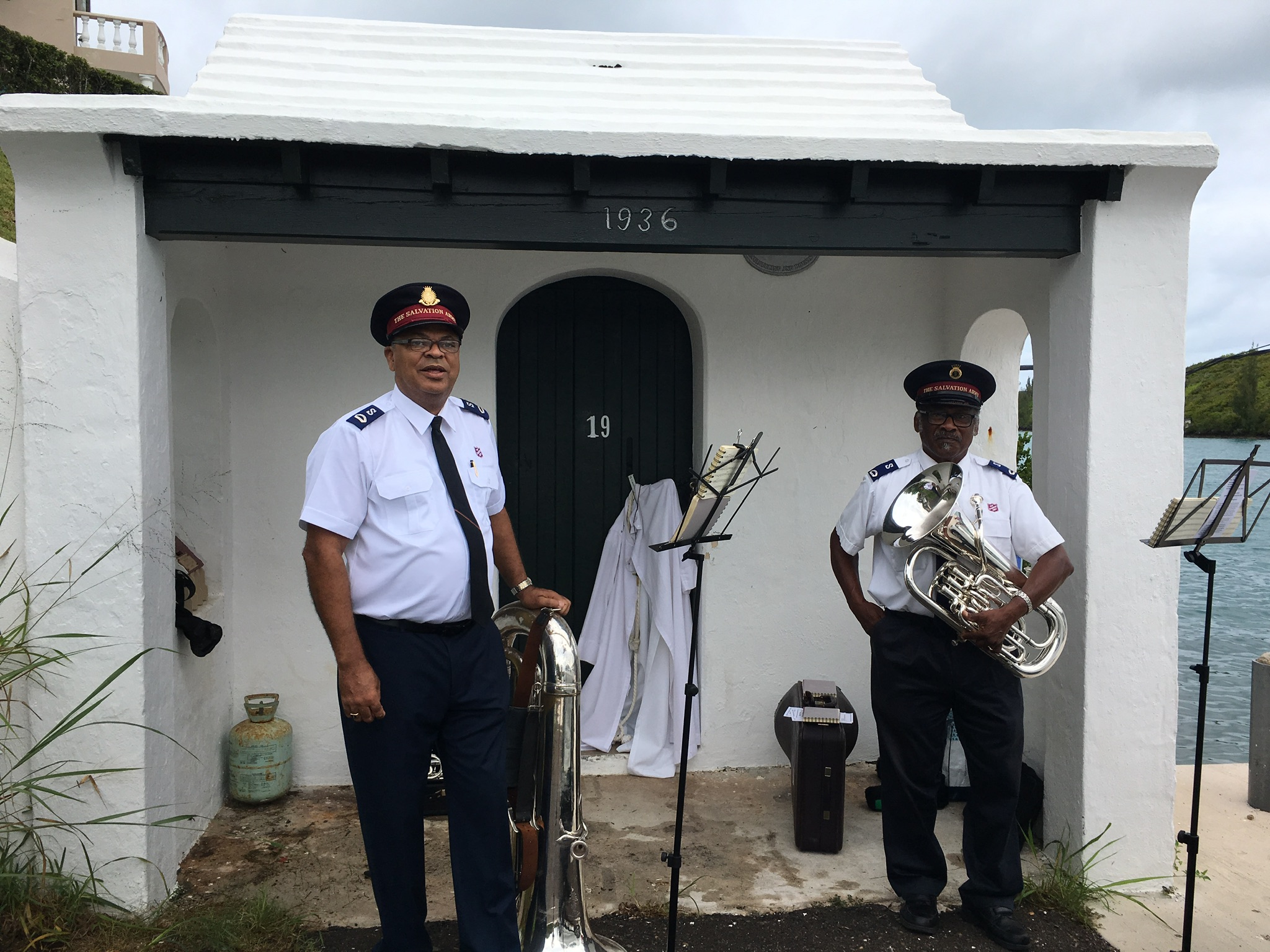 So when we first arrived boats were starting to come into the Harbour, which is tiny – just enough room for three boats to dock. There’s a little shelter there where the Ferry used to pick up passengers, with 1936 painted on it and kept in very good repair. Some chairs were placed for people to sit, and the Salvation Army band arrived and set up. Sea scouts, gigs, the Harbour Pilot, and an array of other private boats came in to attend the service and then be blessed. The Bishop of Bermuda and the Rector of the Parish of St George in traditional robes took the service along with the Server who lead the Prayers, readings by the Assistant, and hymns accompanied by the Band. Then the boats came in one by one receiving their blessing by prayer, a splash of holy water, and an official certificate given via a fishing net lowered over for the captains to receive. Lastly, the official party boarded a transport boat which sailed them around the Harbour to make sure all the boats got included. It was a really lovely ceremony. My lovely Husband and I were very pleased our thoughtful friends told us about it, and included us. I have to admit I did spend a little time on the dock eyeing up the two bottles I could see over the side, and wondering if it was a bit deep…