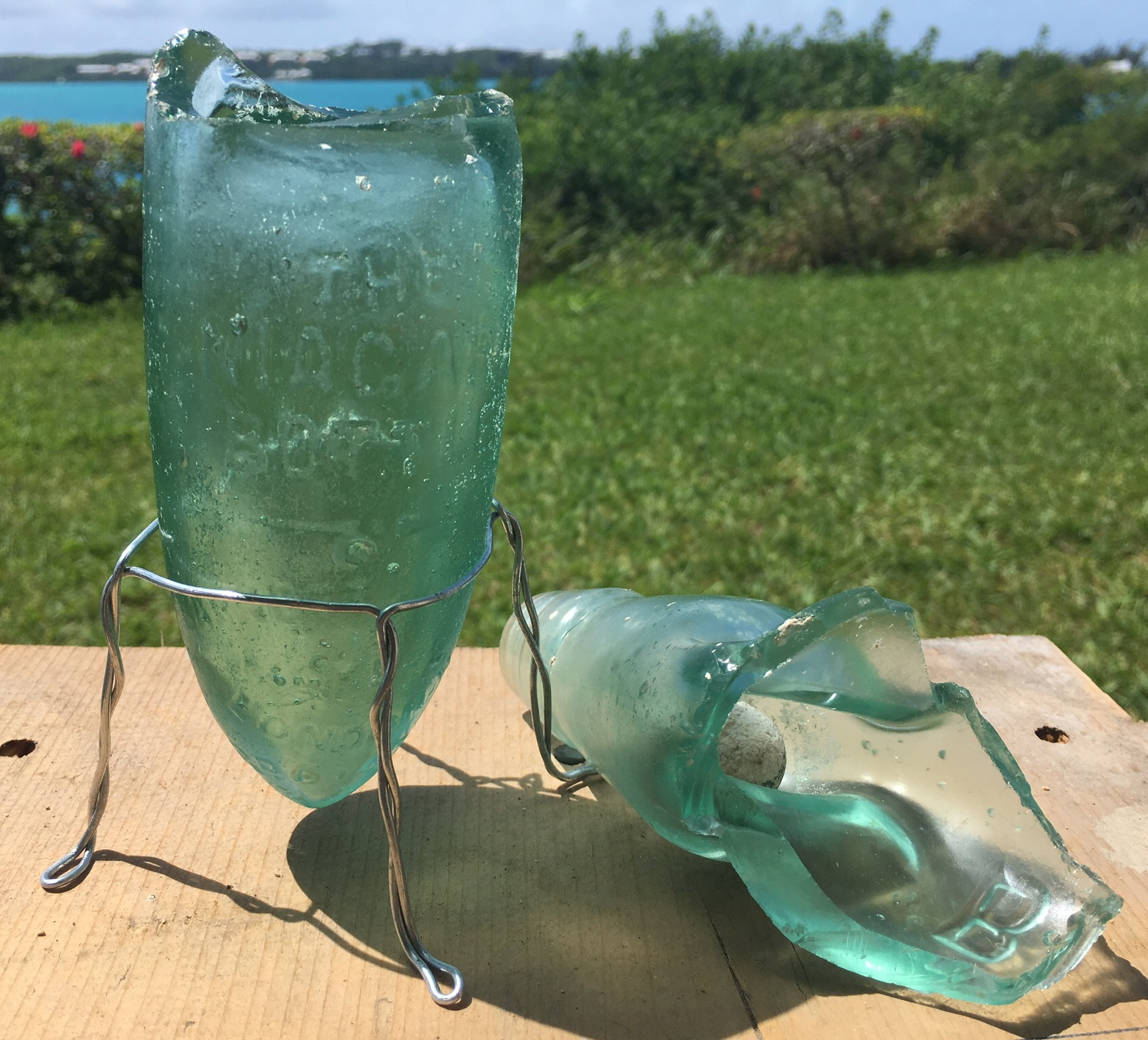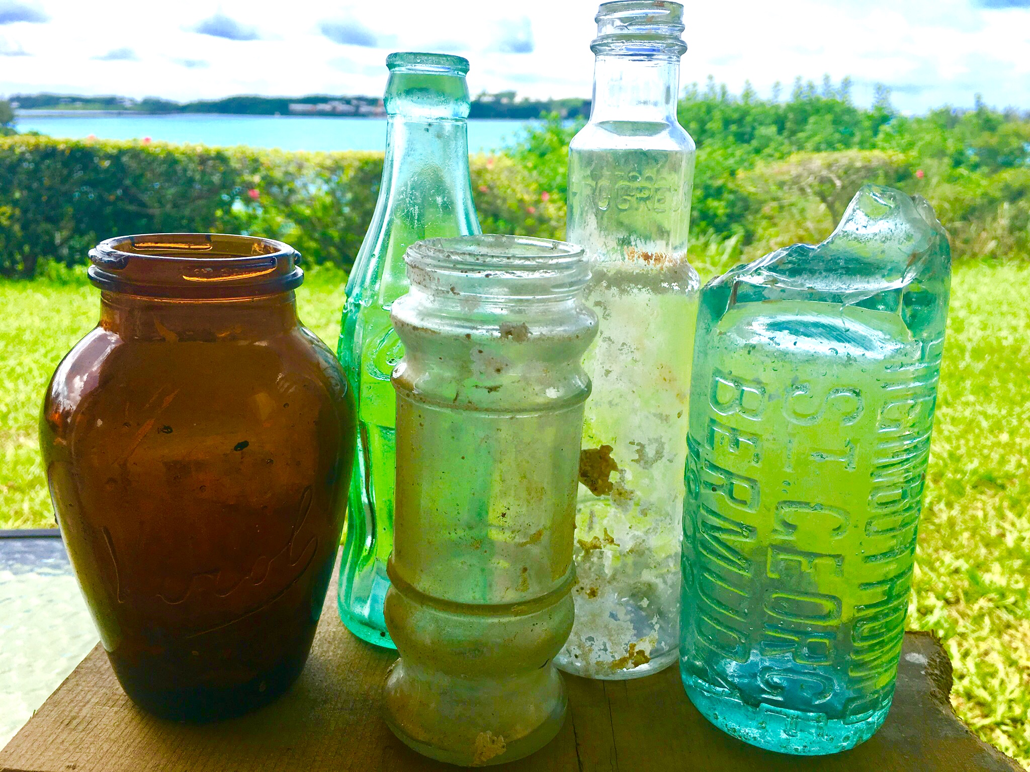 The other reason I go snorkeling, is probably inherited from my Dad, who loved finding and collecting old glass bottles. Now New Zealand isn’t really old, not in a European settlers kind of way, it’s only getting near two hundred years. Bermuda was found in the sixteen hundreds, and has hundreds of wrecks around it’s cheese grater coral reef. So it’s fair to say there’s got to be some real beauties out there. I think to really seriously collect them, I would need to learn to dive properly. But I’m quite happy puddling about in bays, not too far from the shore, having a scratch around with my trowel. I’m always careful not to disturb coral, habitats, and anything that could be growing. That ensures that everyone gets to enjoy the marvel of it. We are getting quite a few bottles though, and one of my friends in New Zealand asked what we plan on doing with them. I actually don’t know. We can’t stay in Bermuda forever as we are not Bermudian, and not rich enough to buy our way in. Even with end over end contracts, we can only stay a maximum of ten years, then it’s three weeks and off island. That does make planning tricky. My lovely husband has alleviated some of my crisis by suggesting, gaining permission, and with my help, installing a lovely bottle shelf. You might notice that some of the bottles are not cleaned up, that’s because we’re not keeping those ones, and will, put them back. Literally. Then someone else can have the joy of finding them. Some are really special though. We have found parts of torpedo bottles, marble soda bottles, clay pipes and the bottom of onion bottles. Ink wells are my favorite and I have two stoneware ones, but the glass one’s evade me so far. Then there’s the newer ones like old coke cola green bottles, Pepsi soda, blue Vick’s vaporub, and my favorite the brown Virol bone marrow jar (yuk!). That’s now a nice candle holder as it’s depth and shape keeps out the wind. Turns out it could be worth about forty dollars! The nineteen forties influence is obvious as the navy base was here around then, so we find perfume, navy issue alcohol bottles of all kinds, and various lotions, potions and elixir bottles which were favorites during those times. These aren’t so old but they’re getting up there. I try to find bottles that were corked, and we have many french blob top wine bottles, and other blob tops of different styles shapes colours and sizes, some with a space for the wire or string to keep the cork in. Occasionally the cork is still inside, which is quite exciting. The way a bottle is made is important too. If it’s moulded, how many parts, does it have a mark on the bottom, was it hand blown then finished off by machine, or was it completely hand blown from scratch? I have a nice little book that’s my bottle bible and we’re always pouring through it comparing what we’ve found.