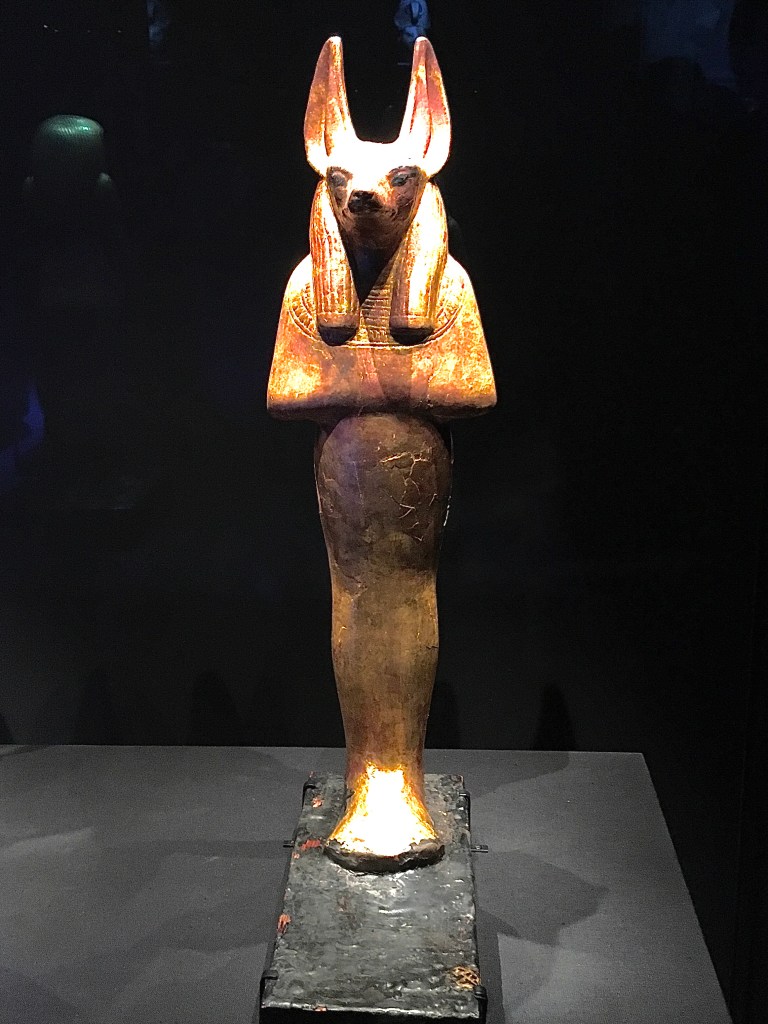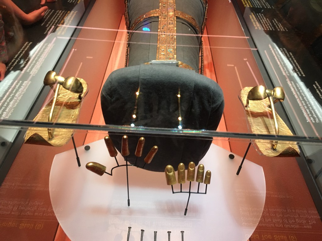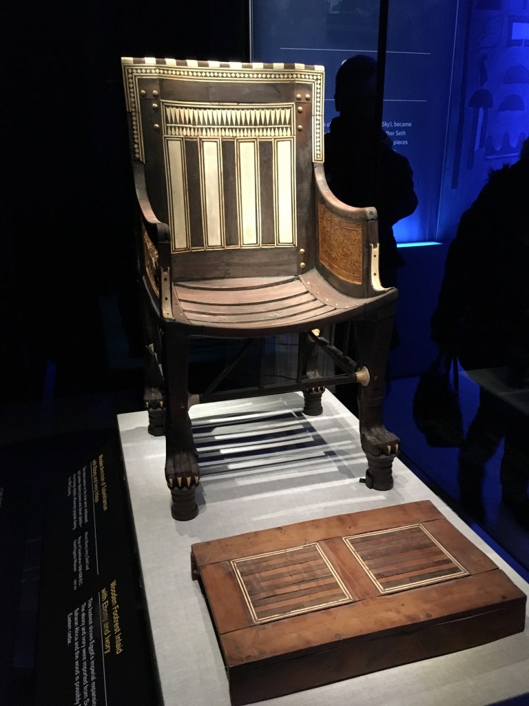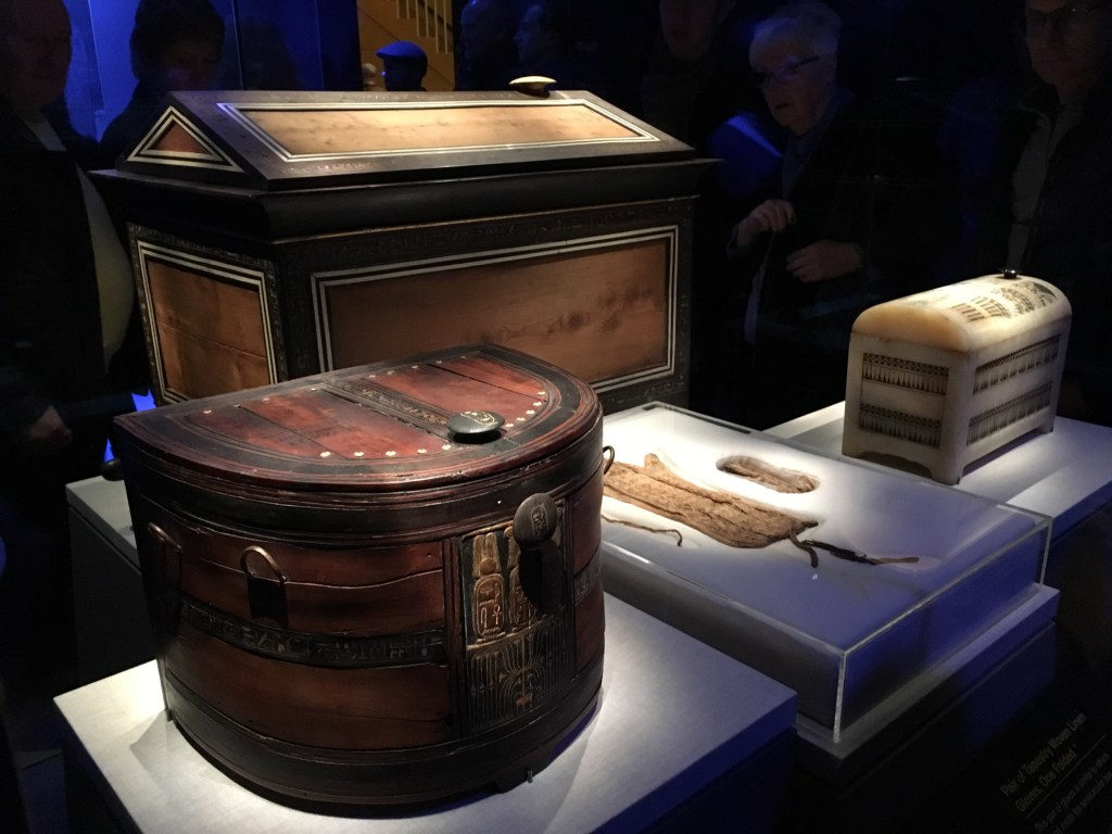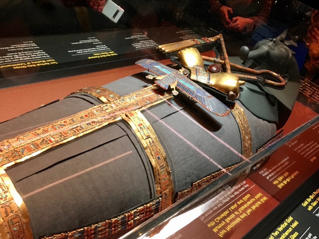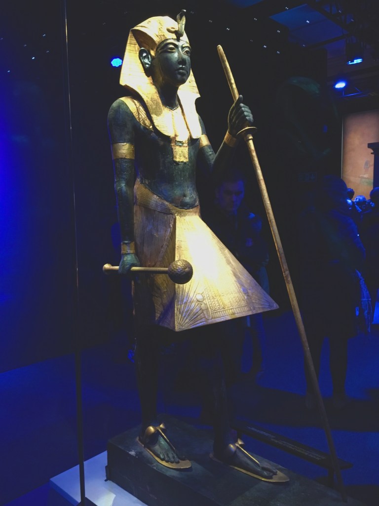 While in London, we had the opportunity to go to the Tutankhamun exhibition.  I have to say that it was well worth the cost, the queueing, and the travel to get to it. Usually when these displays are put on, there’s a few items of interest and a lot of information, and people come away a bit disappointed.  This was quite different.  There was an excellent range of different possessions from Tutankhamun’s tomb, both practical and personal, along with lots of really interesting informative history about excavating the site.  My lovely husband picked this to do, and I got a bonus as well afterwards.