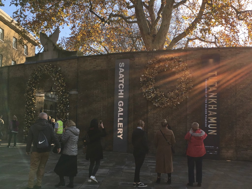So while in London we stayed out at Gatwick, simply because it’s cheaper.  The closer you get to the centre of London, the more expensive it is.  I find that Holiday Inn Hotels have everything the bigger brand names have, but for a better price, and the staff there are always courteous and very helpful.  It was amusing though, that not one single actual English person was on duty, but mainly Polish amongst other Nationalities.  I wonder what will happen when Brexit is finally realised, and if people don’t qualify for residency? I expect they will have to go back to their country of origin.  Britain will be short staffed for a while, until they realise they have to clean their own toilets and get their own breakfast!  No time for breakfast today though, and off to Gatwick Airport to get the train up to Victoria.  Then from Victoria to Sloane Square on the Underground, and a short walk to Saatchi Gallery.  Sloane Square is quite a posh area, so we had a walk around exploring while we had a little time to spare.  I had forgotten that my winter boots were in storage, miles away in Wales, so I had a new pair in mind.  Most of the shoes were around the three hundred pounds mark, a bit expensive for me.  I did find a pair nearer my price range, but the realisation that I would wear them for one week, and then have no use for them for at least six months, put me off.  I had old work shoes which were comfy enough, just not warm.  One more day!