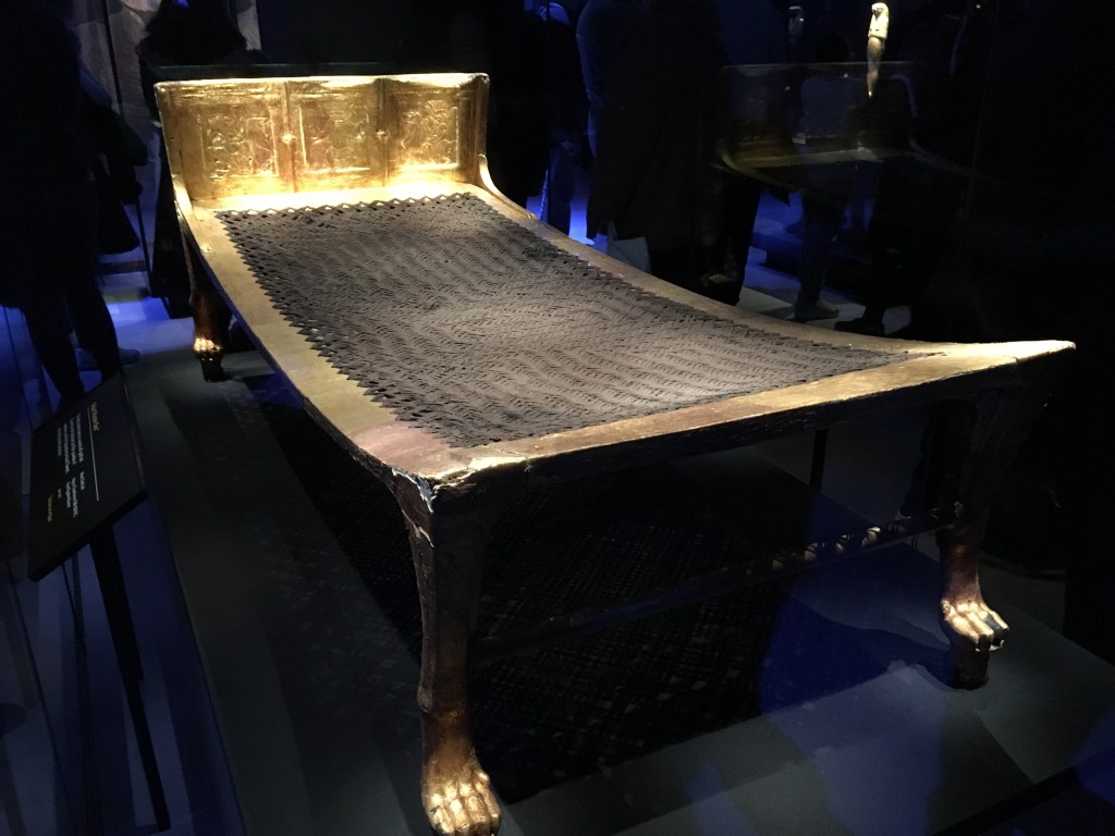 The exhibition had one hundred and fifty pieces from the tomb, with sixty of those being seen for the first time outside Egypt.  Having never been to Egypt, this was quite exciting for me, and it’s the kind of archeology that captures my interest.  The Egyptians were such an advanced culture, there’s got to be a missing link somewhere.  You will notice that my blog has been a bit devoid of photos so far, but at the end I’ll put a photo slide show of the best bits, or at least my best photos.  It was alright to take them, but not to use the flash.  I liked the personal items the best.  The tiny chair he sat in when he took over as Pharaoh at just nine years old, the bed he slept in, the games he played with his wife, who was also his half sister.  There were sad things too.  Two tiny mummies of babies were entombed with him, the children they had that didn’t live.  I guess there would be no understanding of genetics back then.  The actual mummies were not in the exhibition, but Tutankhamun’s  ‘death mask’ copy was, and this was depicted as though the mummy was there wrapped in cloth.  There were also gold finger and toe caps that fascinated me, to protect his precious hands and feet.  A gilded box was beautiful, embossed metal, quite large, about the size of your oven door, with scenes depicted of their happy marriage – but it was too shiny and my photo was dreadful.  I found it really interesting, like a cartoon snapshot of life at around 1324 BC.  The jewellery had the finest enamelling and engraving work I have ever seen, made with precious metals known at the time. It was just a beautiful.
