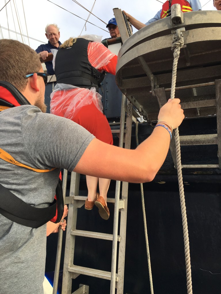 The first challenge was the floating pontoon, attached to the main dock. Where the ship was docked, an extension had been attached, by metal gangway stairs, then onto a floating pontoon, then more gangway stairs up to the ship. The six of us, wheelchair, cane, and luggage, had to guide, wheel, and hump our way up to board. This was no mean feat as the pontoon was really rocky and none of us were prepared for that this soon. Never the less, with a bit of help from the Permanent Crew, we got there. We weren’t on for long and we had already met several people, and realised we weren’t the first. We were split up immediately into pairs of support and buddy, met our watch leaders, then stowed our things in the appropriate bunk rooms. Next we went along to the lower mess to meet with Stevie the ships Nurse, and hand over our passports. We were then ushered to the other side of the room where we received our wet weather clothes, climbing harness, and safety belt. These were to be stored on our hooks with our bunk number on them, in a different part of the ship. This felt all quite rushed. We then got to unpack our bags into one little cupboard with two shelves, and stow it around our bunk in compartments available there too. We also had a hook for coats or towels, a clothes line above the bunk for washing, and a pole and a rope to help get up onto the top bunk. The man in Branden’s bottom bunk took one look at his size, and quickly swapped bunks with him. I also had a top bunk, and wondered how I would haul my 50 something body up onto there with no ladder, but I got surprisingly good at it. A matter of having to I guess, but I also got worse and worse at remembering everything I needed, and was dismayed to find my self climbing several times, needlessly.